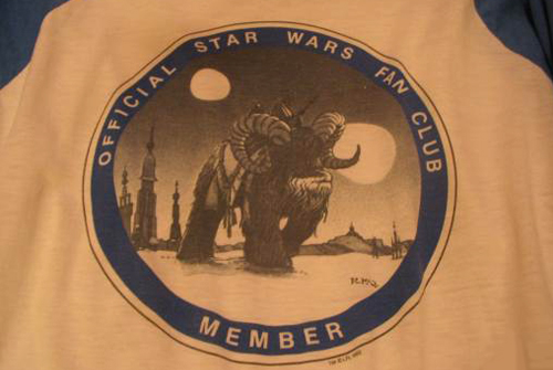 Phil Tippett’s tauntaun shirt from The Empire Strikes Back. Tippett is credited with stop-motion animation and miniature and optical effects for the movie. The artwork is by Ken Ralston and is dated 1979. This is the current Holy Grail. Tippett recently auctioned his off and it fetched $3000. The rumour is that only a dozen were made.